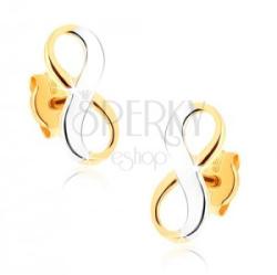 Ródiumozott fülbevaló 9K sárga és fehér aranyból végtelen szimbólum - fekvő nyolcas alakban. A fülbevaló felszíne enyhén domború, sima és fényes, miközben a hátsó oldala üreges. Stekkeres kapcsolás. A fülbevaló méretei:10 x 4 mm A fülbevaló súlya: 0,37 gFémjelzéssel ellátott. Az ár egy párra vonatkozik. A ródiummal kezelt felület az ékszer tartósságát, kemén