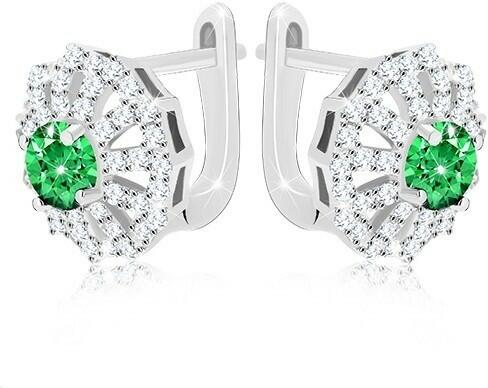 Ródiummal ellátott fülbevaló 925 ezüstből virág alakkal és sziromkörvonalakkal, melyek átlátszó csillogó cirkóniákkal vannak kirakva. A virág közepét kerek csiszolt zöld cirkónia alkotja. A fülbevaló kapcsolása orosz patent. Fülbevaló mérete: 12 x 12 mmFülbevaló súlya: 4,4 gFémjelzéssel ellátott. Az ár egy párra vonatkozik. A ródiummal kezelt felület az ékszer
