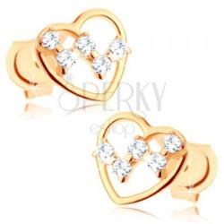 Fülbevaló 14K aranyból vékony egyenletes szív körvonallal, amelyben díszesen elhelyezett kerek cirkóniák vannak átlátszó kivitelezésben. A cirkóniák "w" alakba vannak rendezve. Biztonságos viselését stekker biztosítja. A fülbevaló méretei: 6 x 6 mmA fülbevaló súlya: 0,5 gFémjelzéssel ellátott. Az ár egy párra vonatkozik.