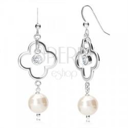 925 ezüst fülbevaló sima kontúr lóhere - szerencse jelkép, amelyben egy kerek cirkónia van rögzítve. A lóhere alsó részén egy fehér golyó függ, amely gyöngy hatását kelti. A fülbevaló akasztós kivitelben készült. A fülbevaló méretei (akasztóval): 19 x 53 mmA díszes rész méretei (lóhere a gyönggyel): 19 x 41 mmGyöngy átmérője: 10 mmA fülbevaló súlya: 6,7 g F