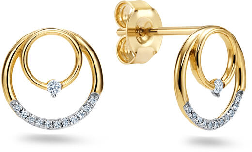 Gyémánt körökkel díszített sárga arany csokornyakkendő fülbevaló 14 karátos fehér aranyból. A finom körök formájú dizájnt 0,07 ct össztömegű természetes gyémánt díszíti. A gyémántok H színű és SI1 tisztaságúak, ami fényességet és ragyogást kölcsönöz nekik. A precíz szabás és a szimmetria biztosítja, hogy ezek a drágakövek maximálisan visszaverjék a f