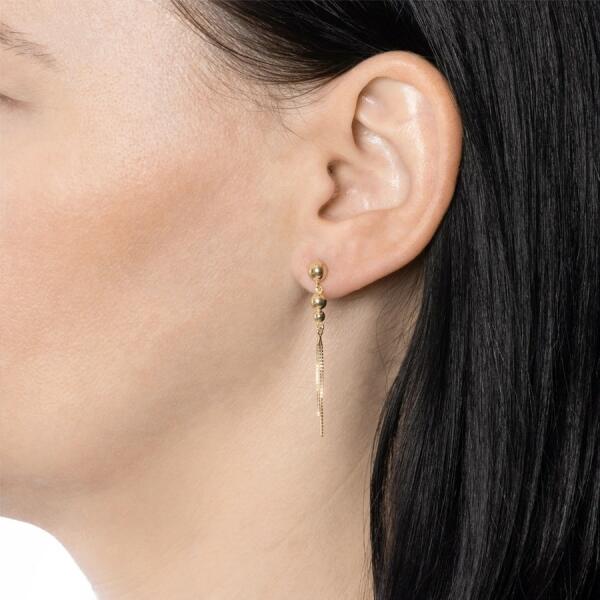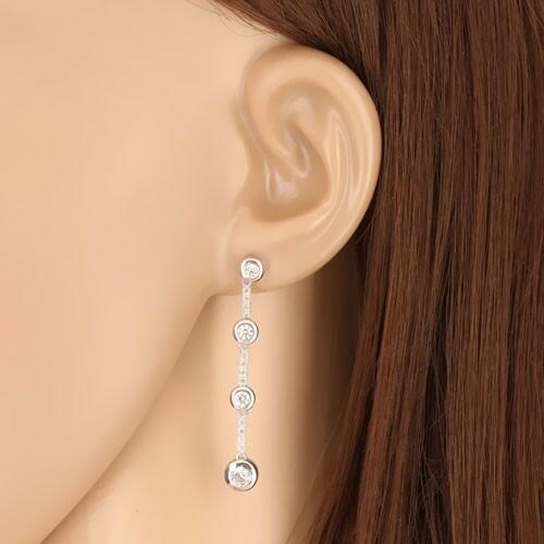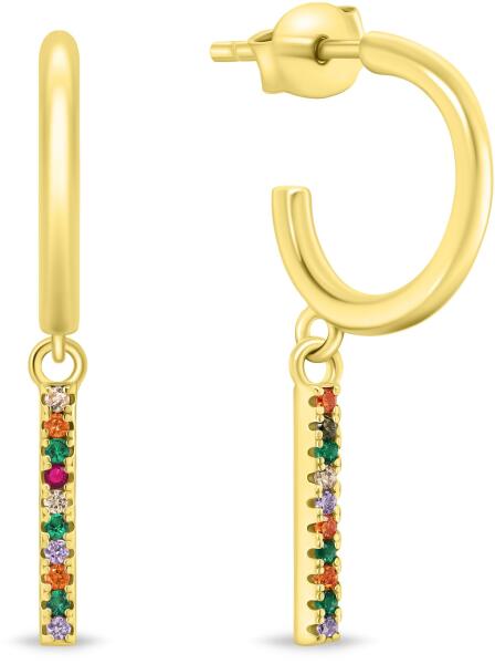 A fülbevaló 9K fehér aranyból készült. A mintát enyhén kiemelkedő karikák és függő téglalapok alkotják. A karikák közepét kerek áttetsző cirkónia díszíti. A karikák szélein keskeny rések találhatók. Az utolsó karika átmérője a többinél szélesebb. A téglalap sáv elölről kisebb kerek cirkóniákkal kirakott. A fülbevaló bedugós, stekkeres. A fülbevaló mér