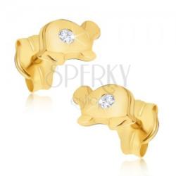 Arany beszúrós fülbevaló kicsi fényes teknős alakban, mely páncélján apró csillogó kerek átlátszó kő van beültetve. Biztonságos viselését stekker biztosítja. A fülbevaló méretei: 7 x 4 mmA fülbevaló súlya: 0,3 gFémjelzéssel ellátott. Az ár egy párra vonatkozik.