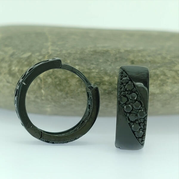 Fekete színű fülbevaló, melyet fekete cirkónia kristályok tesznek csillogóvá. A kristályok karmos foglalatban helyezkednek el, a fülbevaló elülső felét díszítik, a hátulja áttört mintás. Időtálló darab, nem kopik, nem feketedik, nem színezi a bőrt ( "gold filled"). Antiallergén ékszer, nem okoz panaszokat fémérzékeny hölgyeknek sem. Fülbevaló szélessége: 5 mm. Ka