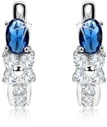 Fülbevaló 925 ezüstből, amelyet, ovális, kék kő alkot, csiszolt felülettel, foglalatban, négy karommal odaerősítve. A kő alatt egy virág található száron, kisebb, átlátszó kövekből. Pattintós kapoccsal záródik. A fülbevaló méretei: 6 x 16 mmA fülbevaló súlya: 4,02 gFémjelzéssel ellátott. Az ár egy párra vonatkozik.