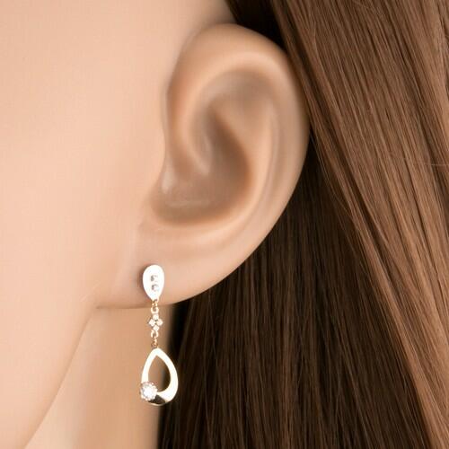 Ródiumozott fülbevaló 9K aranyból fordított matt cseppből mely fehér aranyból készült és fenyes a szegélye, ez alatt egy láncra akasztott nagyobb cseppkörvonal függ. A kisebb cseppet és a láncot is apró átlátszó cirkóniák díszítenek. A sárga arany cseppkörvonalon nagyobb kerek átlátszó cirkónia található. A fülbevaló kapcsolása stekkeres. Fülbevaló méretei: 7