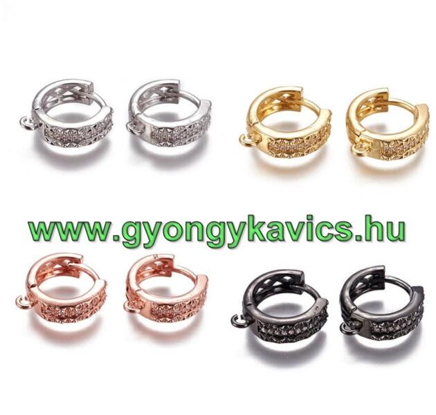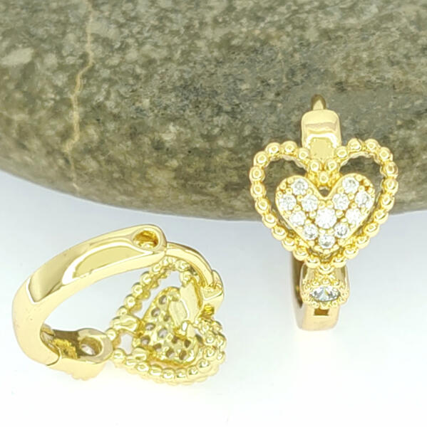 Aranysárg színű karika fülbevaló, melyet szív minta díszít és fehér cirkónia kristályok tesznek csillogóvá. A kristályok karmos foglalatban helyezkednek el. Időtálló darab, nem kopik, nem feketedik, nem színezi a bőrt. Antiallergén ékszer, nem okoz panaszokat fémérzékeny hölgyeknek sem. 14K arany színben kapható. Szív minta mérete: 9 mm x 11 mm. Karika belső átmér