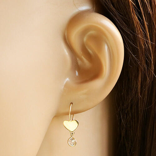A 14K sárga arany fülbevalót egy szimmetrikus, sima felületű szív és egy kerek gyűrű díszíti, amely a szívhez van rögzítve. A gyűrűn egy fényes és sima foglalat függ, amelybe egy csillogó csiszolt átlátszó cirkónia van helyzve. A fülbevaló afrikai horgon függ. A fülbevaló mérete (zárszerkezettel együtt): 7 x 20 mmA fülbevaló súlya: 0,69 gFémjelzéssel ellátva.