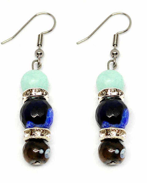 Az ékszer ásványai és tartozékai: – 8 mm-es matt kék jade ásványok – 10 mm-es fazettált kék-fekete achát gyöngyök – 8 mm-es matt kék csíkos achát gyöngyök – Ezüst színű strasszos díszek Akasztó anyaga rozsdamentes acél. Áruházunkban találsz hozzáillő karkötőt is. Az ékszerben található ásványok jótékony hatásai: ACHÁT Testünkre: Az achát ásványok