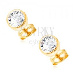 Arany fülbevaló 585 fényes sima kerek alakú foglalattal, melybe kerek átlátszó cirkónia van beültetve. Beszúrós kapcsolás. A fülbevaló átmérője: 5 mmA fülbevaló súlya: 0,6 gFémjelzéssel ellátott. Az ár egy párra vonatkozik.
