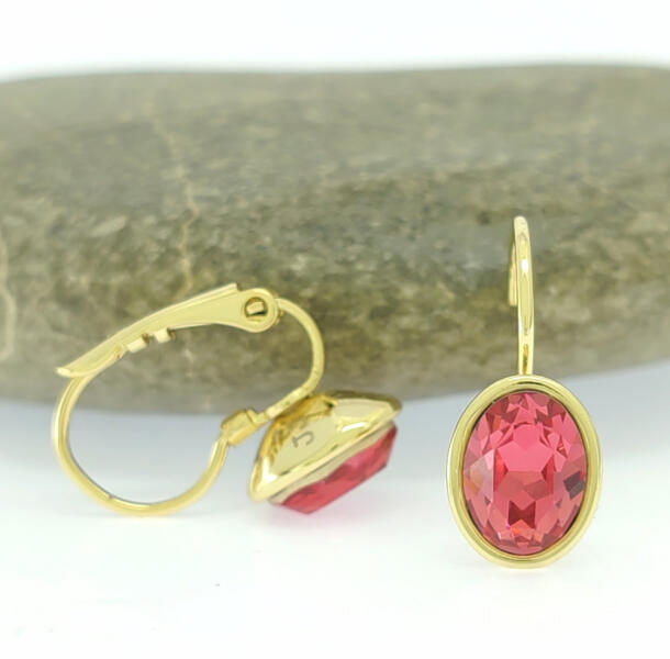 Aranysárga színű fülbevaló, melyet sötét rózsaszín Swarovski kristály tesz csillogóvá. A kristály ragasztott, peremezett foglalatban helyezkedik el. Időtálló ékszer, nem kopik, víz hatására nem feketedik. Antiallergén ékszer. 14K arany színben kapható. Fülbevaló teljes hossza: 17 mm. Kristály szélessége : 8 mm. Kapcsos rész belső hossza: 15 mm. Az antiallergén éksz