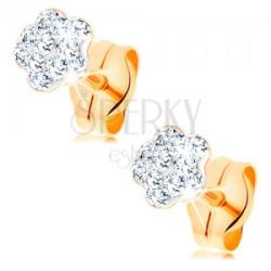 585 arany fülbevaló kis virággal, csillogó átlátszó Swarovski kristályos díszítéssel. A kristályok fehér anyagba vannak beültetve, mely a virágot fedi. A fülbevaló kapcsolása stekkeres. A fülbevaló mérete: 4 x 4 mmSúly: 0,3 gFémjelzéssel ellátott. Az ár egy párra vonatkozik.