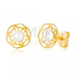 A 14K sárga arany fülbevaló díszesen kivágott fényes virág alakú. A virág finoman ívelt, közepében egy fehér színű mesterségesen tenyésztett, enyhén lapos gyöngy helyezkedik el. Biztonságos viselését stekker teszi lehetővé. Fülbevaló méretei: 8 x 8 mmFülbevaló súlya: 0,5 gFémjelzéssel ellátott. Az ár egy párra vonatkozik. A tenyésztett gyöngy apró idegen anyag