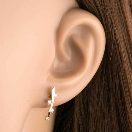 375 arany fülbevaló aszimmetrikusan megtört lapos pálcikából sima fényes felülettel. A pálcika villámra hasonlít és mindkét oldalról csillogó kerek cirkóniák vannak hozzá erősítve. Biztonságos viselését stekker biztosítja. A fülbevaló méretei: 4 x 17 mmA fülbevaló súlya: 0,71 gFémjelzéssel ellátott. Az ár egy párra vonatkozik.