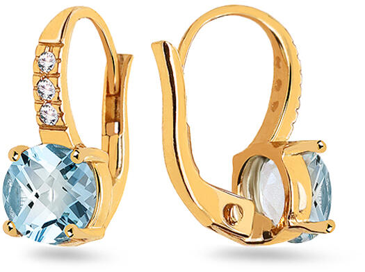 Sárga aranyból készült fülbevaló. A fülbevaló kerek formájú világoskék topázzal és átlátszó cirkóniumokkal tűnik ki. Az ékszer felülete magasfényű.