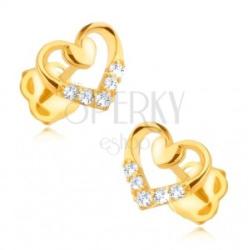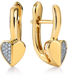 A 14K sárga arany fülbevalót szív körvonal alkotja, amelynek alsó részébe öt csillogó átlátszó gyémánt van beültetve - négy kisebb és egy nagyobb. A felső részben egy kisebb teli szív forma helyezkedik el sárga aranyból. Biztonságos viselését stekker teszi lehetővé. Fülbevaló méretei: 7 x 6 mmA nagyobb gyémánt átmérője: 1,2 mmA kisebb gyémántok átmérője: 1,