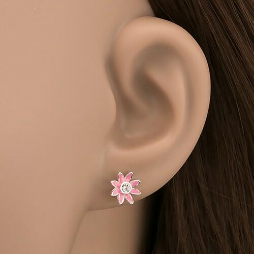 A bedugós fülbevaló sterling ezüstből készült. A fülbevaló fejét rózsaszínű mázzal bevont hosszúkás virágszirmok alakotják. A virág közepén tiszta kerek cirkonkő van A biztonságos viselést a stekker biztosítja. A virág átmérője: 9 mmA fülbevaló súlya: 0,76 gAz ár egy párra vonatkozik. Fémjelzéssel ellátott.