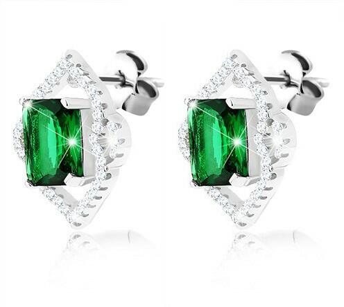 925 ezüst fülbevaló, smaragdzöld színű, téglalap alakú, vágott felületű cirkónia, tiszta levélkontúrral díszítve. A leveleket oldalt két kis, tiszta cirkónia kirakott ív egészíti ki. A fülbevaló stekkeres rögzítéssel rendelkezik. A fülbevaló méretei: méret: 13,5 x 16 mm A fülbevaló súlya: 3,3 g Fémjelzés - van. Az ár egy párra vonatkozik. A ródium felületkeze