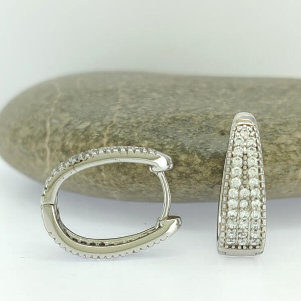 Ezüstszínű fülbevaló, melyet fehér cirkónia kristályok tesznek csillogóvá. A kristályok karmos foglalatban helyezkednek el és a fülbevaló hátulját is díszítik. Időtálló darab, nem kopik, nem feketedik, nem színezi a bőrt. Antiallergén ékszer, nem okoz panaszokat fémérzékeny hölgyeknek sem. Fülbevaló szélessége: 6 mm. Kapcsos rész belső hossza: 14 mm. Fülbevaló