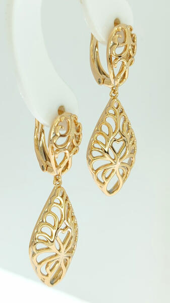 Aranyszínű, áttört mintával díszített függő fülbevaló. Tartós ékszer, fürdéskor nem kell levenni, nem feketedik. Antiallergén ékszer. 18K arany színben kapható. Fülbevaló teljes hossza: 35 mm. Kapcsos rész belső hossza: 10 mm. Fülbevaló szélessége: 11 mm. Az antiallergén ékszerek olyan fémötvözetből készülnek, melyek nem irritálják a bőrt, nem okoznak allergi