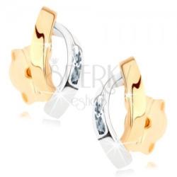 Bedugós fülbevaló 9K sárga aranyból két egyenetlenül elhelyezett félholdból. Az egyik félhold arany a másik pedig ezüst árnyalatú és ródiummal kezelt, átlátszó cirkóniákkal díszítve. A félholdak hátsó oldala üreges. Biztonságos viselését stekker biztosítja. A fülbevaló méretei: 4,5 x 9,5 mmA fülbevaló súlya: 0,5 gFémjelzéssel ellátott. Az ár egy párra vona