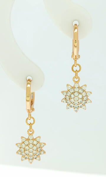 Aranyszínű karika fülbevaló, melyet csillogó, fehér cirkónia kristályos csillag alakú függő díszít. A kristályok karmos foglalatban helyezkednek el. Tartós ékszer, fürdéskor nem kell levenni, nem feketedik. Antiallergén ékszer. 18K arany színben kapható. Fülbevaló teljes hossza: 26 mm. Karika belső átmérője: 8 mm. Fülbevaló szélessége: 10 mm. Az antiallergén éksze