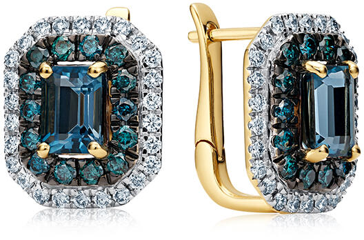 Sárga aranyból készült fülbevaló. Az ékszert összesen 80 db kék és tiszta gyémánt díszíti, melyek össztömege 1370 ct. A központi díszítés egy London Blue topáz drágakő, melynek össztömege 2620 ct.