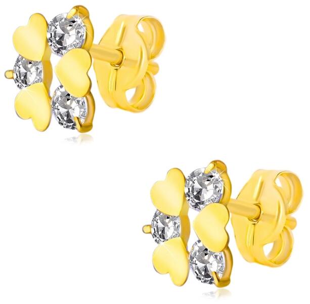 A fülbevaló méretei: 7 x 7 mmA fülbevaló súlya: 0,62 gFémjel – van. Az ár egy párra vonatkozik. Virág alakú 9K sárga arany fülbevaló szív alakú szirmok és átlátszó cirkóniák játékos kombinációjával ejti rabul. Minden szirom gondosan kidolgozott, az arany szívek meleg fényt adnak az ékszereknek, míg a cirkóniák finom kontrasztot hoznak létre. A stekkeres rögzít