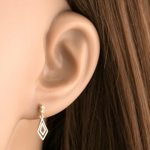 Fülbevaló 14K sárga aranyból átlátszó cirkóniák kettősével, amelyek alatt egy rombusz alakú körvonal függ fekete árnyalatban. A hátsó oldal fényes és egyenes, miközben gravírozott pontok díszítik. Biztonságos viselését stekker biztosítja. A fülbevaló méretei: 5 x 15 mmA fülbevaló súlya: 0,9 gFémjelzéssel ellátott. Az ár egy párra vonatkozik.