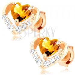 9K sárga színű arany bedugós fülbevaló, amely vékony, fényes szív körvonal alakban kapható, az alsó része pedig apró, átlátszó cirkóniákkal van díszítve. A szívkontúr közepének a felső részén csiszolt, szív formájú citrin van elhelyezve, világossárga árnyalatban. Biztonságos viselését a stekker biztosítja. A fülbevaló méretei: 8 x 7 mmA fülbevaló súlya: