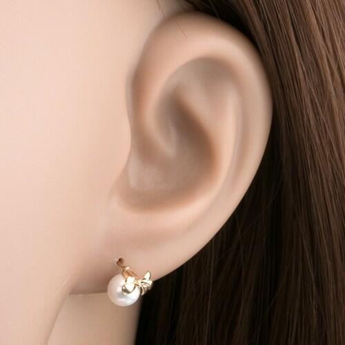 Fülbevaló 14K sárga aranyból kis csillogó masni alakban gravírozott részletekkel, mely alatt fényes fehér színű gyöngy található. A fülbevaló kapcsolása stekkeres. Fülbevaló mérete: 6 x 7 mmSúly: 0,7 gFémjelzéssel ellátott. Az ár egy párra vonatkozik.