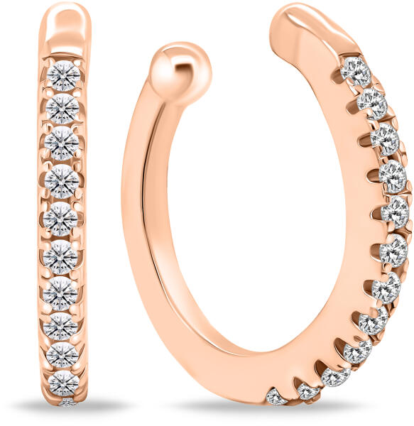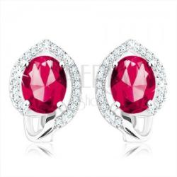 925 ezüst fülbevaló ovális cirkóniából pirosas rózsaszín árnyalatban, csiszolt felülettel. A kő körvonala átlátszó cirkóniákkal van kirakva. A cirkóniás szegély asszimetrikus, a felső részén enyhén spicces alakú. Az alsó részén pedig folytatólagosan egy hurkot alkot, amely sima és fényes. Orosz-záras kapcsolással viselhető. Fülbevaló mérete: 11 x 16 mmFülbeva
