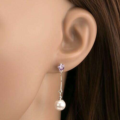 Fülbevaló 925 ezüstből lila cirkóniás virággal, mely alatt fehér gömbölyű gyöngy függ, vékony egyenes pálcikára akasztva. A gyöngy fényes virággal kapcsolódik a pálcához. A fülbevaló kapcsolása stekkeres. Fülbevaló méretei: 8 x 33 mmFülbevaló súlya: 1,5 gFémjelzéssel ellátott. Az ár egy párra vonatkozik.