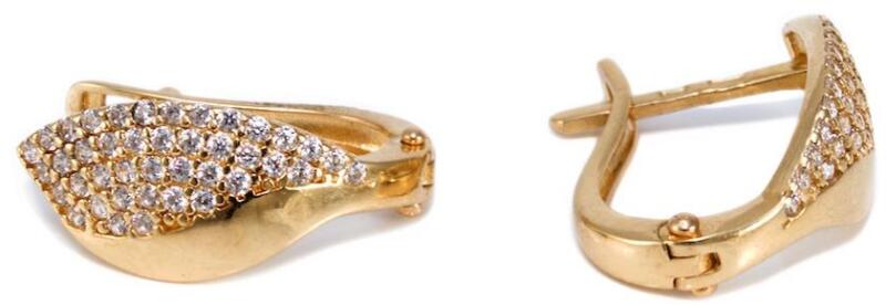 Modern stílusú, levelet stilizáló, cirkónia kövekkel ékített arany fülbevaló.