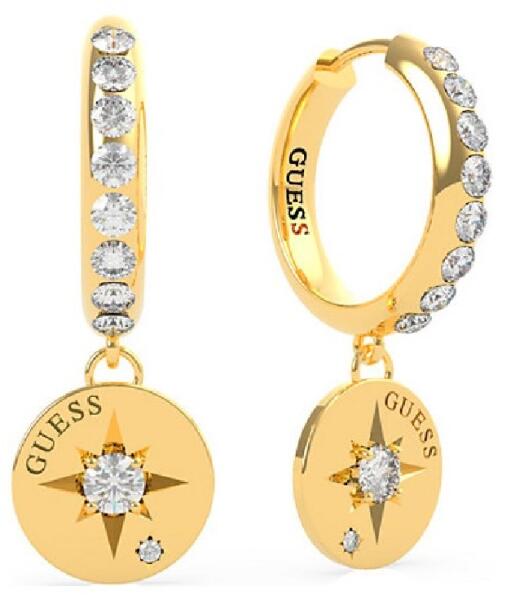 Női fülbevaló Guess UBE20021 sebészeti acélból. Dizájner stílusos és modern fülbevaló. A dísz és a gyűrűk is strasszkövekkel díszítettek. A minőségi és egyedi ékszereket kedvelő hölgyek számára ezek a fülbevalók a megfelelő választás lesznek! Az ékszer aprólékosan kidolgozott dizájnját dekoratív ezüst strasszkövek egészítik ki. Az ékszer arany színe bizto