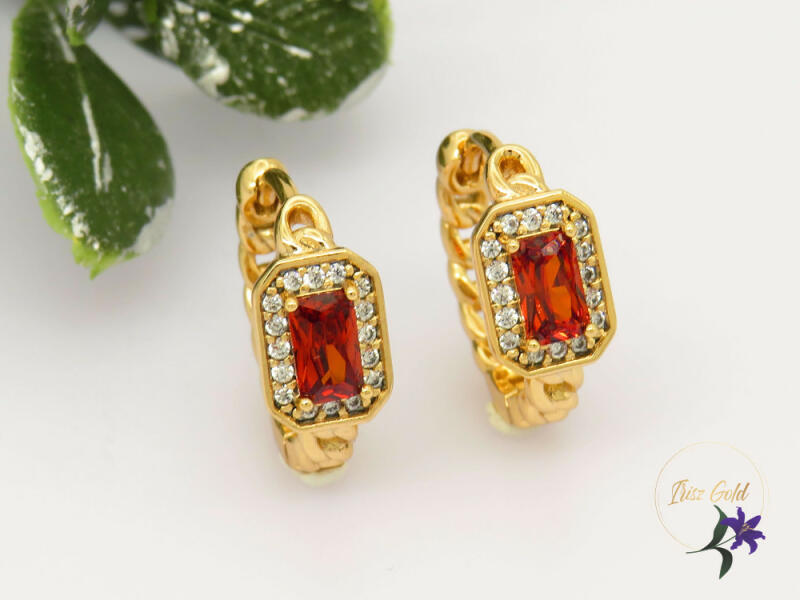 Gold filled kiskarika fülbevaló piros kővel kocka foglalatban Szin: 18K Méret: 15x7mm Kő: 7x4mm Zár karika : belső átmérő :12mm A forgalmazott divatékszerek alapanyaga nikkel és ólommentes ezért többnyire nem okoznak allergiás tüneteket, nyugodtan hordhatják fémérzékeny emberek is. Általában nem színezik a bőrt és más divatékszerekhez képest nagyságrendekkel jobb kop
