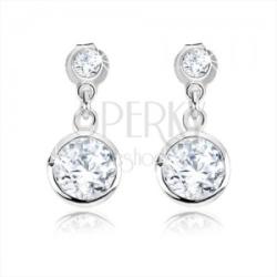 Bedugós fülbevaló 925 ezüstből díszesen kivágott hengerrel, amelybe egy átlátszó kő van helyezve. A stekkeren egy átlátszó csiszolt kerek cirkónia függ, amely foglalatban helyezkedik el dísz hosszúkás rovátkákkal. Biztonságos viselését stekker biztosítja. Méretek: 8,3 x 18 mmA fülbevaló súlya: 3,0 gFémjelzéssel ellátott. Az ár egy párra vonatkozik.