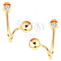 Fülbevaló 14K sárga aranyból kerek átlátszó foglalatba ültetett cirkóniával, mely alatt aszimmetrikus hullámos vonal található. AZ egyik végén tükörfényű sima felületű golyó található. A golyó hátoldala üreges. A fülbevaló kapcsolása stekkeres. Méret: 12 x 15 mmSúly: 1,5 gFémjelzéssel ellátott. Az ár egy párra vonatkozik.