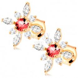 Sugárzó virág alakú 9K sárga színű arany fülbevaló, amely kerek, piros árnyalatú gránát középpel rendelkezik, valamint cirkónia szirmokkal van díszítve. Kis, kerek szirmok váltakoznak nagyobb búzaszem alakú szirmokkal. Biztonságos viselését a stekker biztosítja. A fülbevaló méretei: 11 x 11 mmA fülbevaló súlya: 0,7 gFémjelzéssel ellátott. Az ár egy párra vonatko