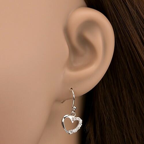 Sterling ezüstből készült egyszerű akasztós fülbevaló fényes, finom vonalú szívkeret alakban. A szívecske egyik felét beágyazott tiszta cirkonkövek díszítik. A kövek a szív alsó része felé fokozatosan nagyobbodnak. Az egyszerű akasztón egy pici ezüstgömb is található. A szívecske mérete: 11 x 10 mmA fülbevaló mérete: 1,4 gAz ár egy párra vonatkozik. Fémjelzésse