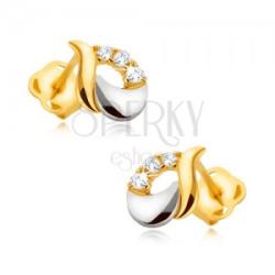 Fülbevaló 9K aranyból csepp alakban, mely felső hullámos vonala sárga aranyból készült, az alsó hold alakú részét fehér arany alkotja a szélein pedig egy kerek átlátszó cirkóniákkal kirakott sáv húzódik. A csepp közepén egy ovális bevágás található. Beszúrós kapcsolás. A fülbevaló méretei: 6 x 8 mm A fülbevaló súlya: 0,5 gFémjelzéssel ellátott. Az ár egy