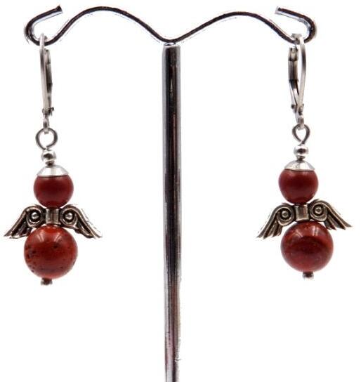 6-8mm-es természetes piros jáspis gyöngyből készített angyal fülbevaló. A fülbevaló anyaga allergiamentes orvosi (nemesacél), az angyalka szárnya tibeti ezüst. Teljes magassága: 38mm A medálkából több darab van, a kép illusztráció. Az ásvány színe, rajzolata némileg eltérhet a képen látottaktól. A jáspis gyógyhatása
