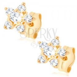 Bedugós fülbevaló 9K sárga aranyból csillogó virág alakban, amely öt, átlátszó cirkóniás sziromból áll. A szirmok a kiemelkedő, kerek, átlátszó követ keretezik. Biztonságos viselését stekker biztosítja. A fülbevaló átmérője: 5,5 mmA fülbevaló súlya: 0,5 gFémjelzéssel ellátott. Az ár egy párra vonatkozik.