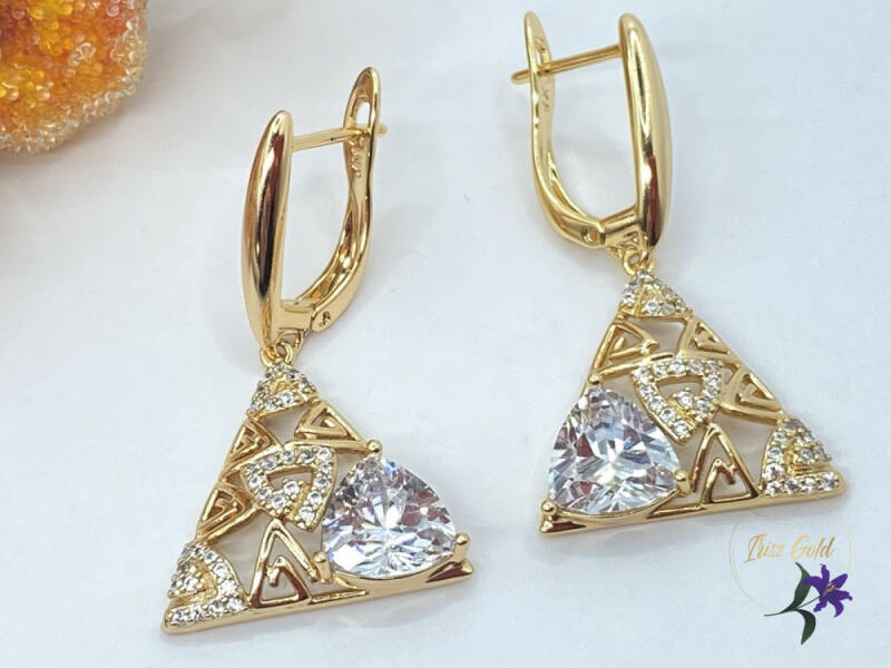 Gyönyörű háromszög fülbevaló fehér cirkonkővel Szin:18K Méret:37x20mm Zár: francia A forgalmazott divatékszerek alapanyaga nikkel és ólommentes ezért többnyire nem okoznak allergiás tüneteket, nyugodtan hordhatják fémérzékeny emberek is. Általában nem színezik a bőrt és más divatékszerekhez képest nagyságrendekkel jobb kopásállósággal rendelkeznek. A fehér (ezü