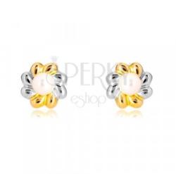 585 kombinált arany fülbevaló , mely virág alakú , középen gyönggyel. A virágnak nyolc enyhén spirális szirma van. Négy szirom fehér aranyból készült. A virág közepén egy kultivált, ovális alakú fehér gyöngy található. Stekkeres zárszerkezet. Méretek 9 x 9 mmGyöngy átmérője: 4 mmFülbevaló súlya: 0,9 g Fémjelzéssel ellátott. Az ár egy párra vonatkozik. A teny