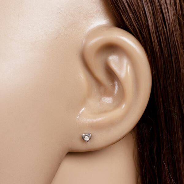 9K fehér aranyból készült fülbevaló, kis szimmetrikus szívvel díszítve, csillogó felülettel. A sima szív közepébe egy átlátszó, csillogó gyémánt van beágyazva. Stekkeres zárral rendelkezik. A fülbevaló méretei: 3 x 3 mm A gyémánt átmérője: 1,5 mm. A gyémánt teljes karátja: 0,03 ct Tisztaság: SI Szín: H A fülbevaló súlya: 0,40 g Fémjel - Van. Az ár egy párra