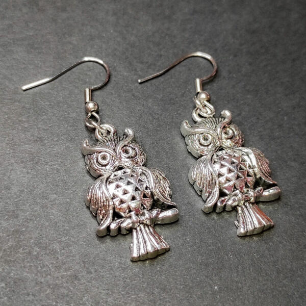 Baglyos fülbevaló. Paraméterek: Mérete kb. 4 cm, bagoly kb. 3,1 cm. Fémötvözet. A függő anyaga fémötvözet, színe ezüst. Akasztó rozsdamentes acélból készült.