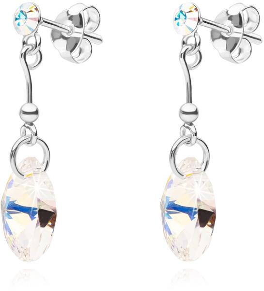 925 ezüst fülbevaló kerek szivárvány árnyalatú kristályból, mely alatt a vékony golyós pálcán egy csillogó és csepp alakúra csiszolt Swarovski kristály található. A kristály világosárga színű, világoskék és lila színű csillogással. Biztonságos viselését stekker biztosítja. A fülbevaló méretei: 8 x 25 mmA fülbevaló súlya: 1,29 gFémjelzéssel ellátott. Az á