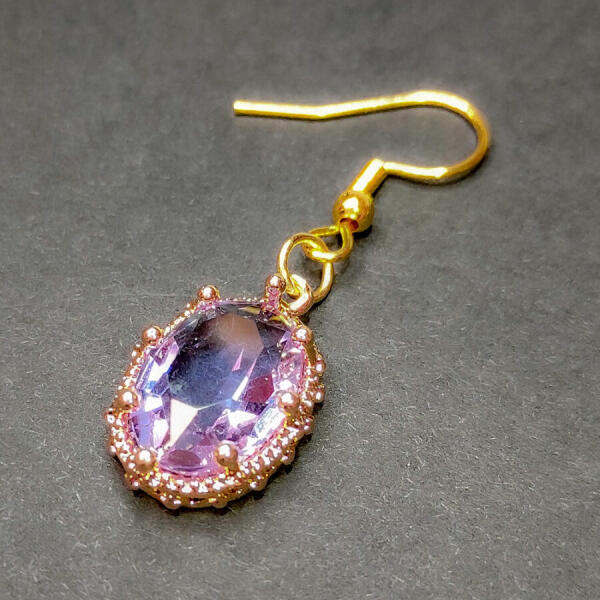 Ovális lila kvarc kristály fülbevaló, 1 pár. A képen egy darab szerepel, de egy párat küldünk. Paraméterek: Medál / mérete kb. 1,8 cm. Anyaga fémötvözet és kristály. Akasztó rozsdamentes acél.