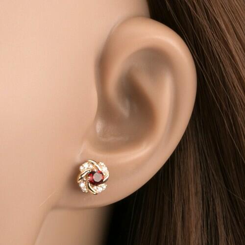 Fülbevaló, amely 14K sárga színű aranyból készült és virág alakú, miközben a közepét kerek alakúra csiszolt piros színű gránát díszíti. A virág szirmai váltakoznak a sima felülettel és az átlátszó cirkóniás szakaszokkal. A közepe körül a szirmok sprirálisan fordulnak. Biztonságos viselését a stekker biztosítja. A fülbevaló méretei: 8 x 8 mmA fülbevaló sú